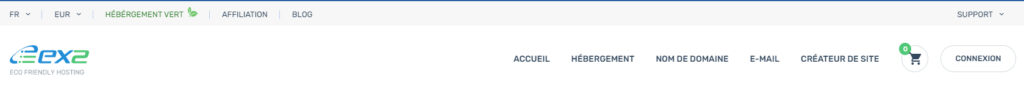 Par exemple, l’en-tête du site d’Ex2 inclut divers éléments. Vous avez des outils pour changer de langue ou de devises, le logo, un menu de navigation et un appel à l’action discret (le bouton CONNEXION)